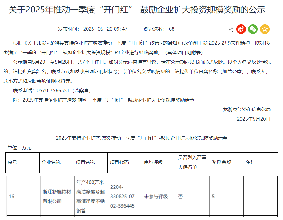 據顯示,浙江新航特材有限公司年產400萬米高潔凈度及超高潔凈度不銹鋼管項目獲獎勵金額5萬元。