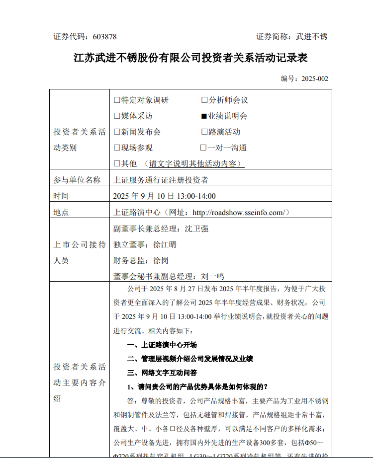 武進不銹9月10日在投資者關系活動中表示,公司產品規格豐富,主要產品為工業用不銹鋼和鋼制管件及法蘭等,包括無縫管和焊接管,產品規格組距非常豐富,覆蓋大、中、小各口徑及各種壁厚,可以滿足不同客戶的多樣化需求。